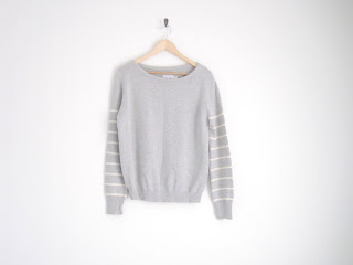 Grey sweater with white stripes on sleeves. Knitted with ribbing on cuffs, bottom hem, and collar.