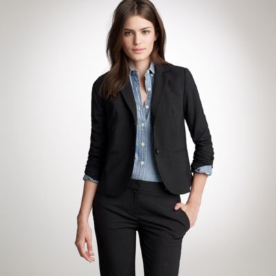 I am refreshing my work wardrobe and am passing on several items that no longer fit me. This jacket is from J. Crew's suiting section and has a more cropped, boxier fit than the 1035. The bi-stretch wool repels lint nicely, and the dark charcoal color works well with black, navy, or grey (or even burgundy) bottoms. Double vent back, two front pockets, and two inside pockets, including a small one specifically to hold pens. I am 5'4" and this hits me just at the hips. Very nicely tailored and well-made, the wool is light enough to transition from season to season. Click here for more stock photos and J. Crew's description.